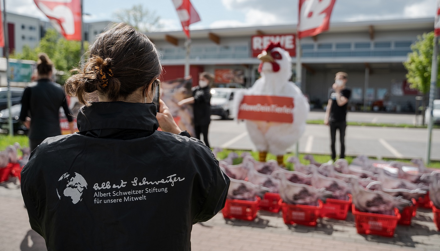 Am Donnerstag-Mittag (20. Mai) protestierte die Albert Schweitzer Stiftung für unsere Mitwelt vor der Niederlassung der Rewe Group (Rewe, Penny u. a.) in der Rheinstraße 8 sowie vor einem Rewe-Markt in Teltow gegen Tierquälerei. Mit 62 Hühnerattrappen in den roten Rewe-Körbchen, einem überlebensgroßen Huhn sowie einem neun Quadratmeter großen Transparent auf einem Truck machten Aktive der Stiftung auf das Leiden der Tiere für Rewe-Fleisch aufmerksam.