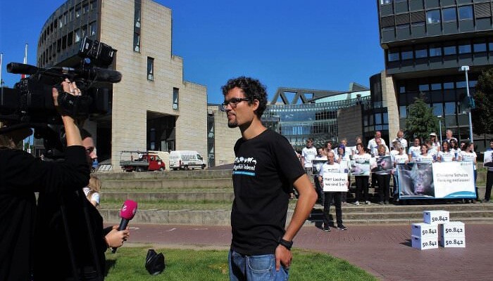 Dennoch hielten wir an einem Termin zur Übergabe fest und liefen am Mittwoch, den 23. August 2017 vor dem Landtag Nordrhein-Westfalens auf. Rund 30 Aktivist:innen aus Düsseldorf und Umgebung kamen zur Unterstützung unserer Aktion. Kurz vor 11 Uhr waren alle mit unseren neuen T-Shirts ausgestattet. Die Zahl der Unterzeichner:innen prangte auf den fünf weißen Kisten, jede stand symbolisch für rund 10.000 Unterschriften.