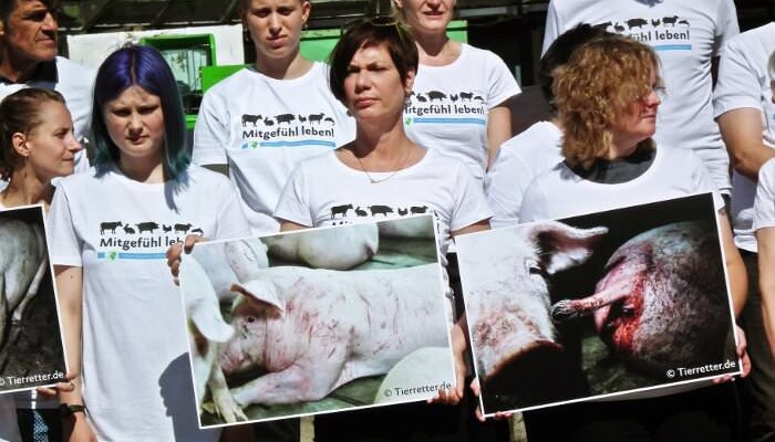 »Herr Laschet, wo sind sie?«, fragten wir auf einem Schild. Großformatige Bilder mit den grauenhaften Aufnahmen aus dem Schweinestall der Landwirtschaftsministerin Schulze Föcking hatten wir ebenfalls mitgebracht. Es dauerte nicht lang, dann kamen schon die ersten Pressevertreter und brachten ihre Kameras in Stellung.