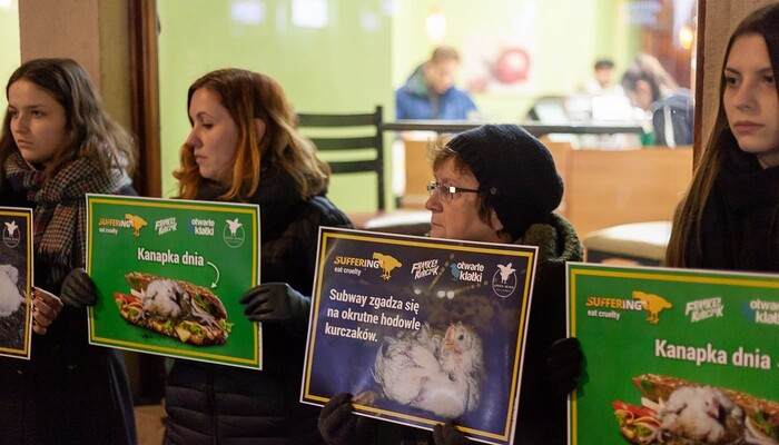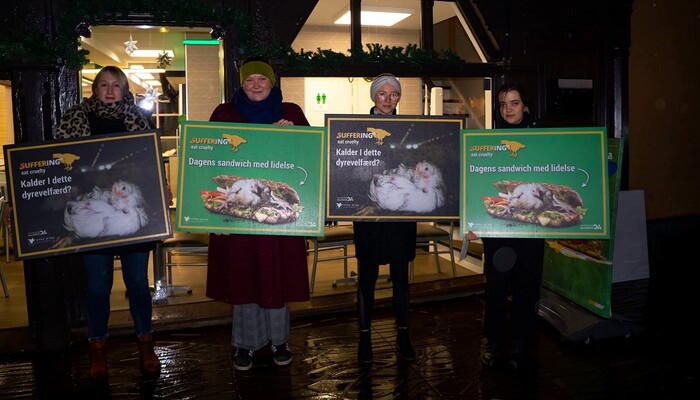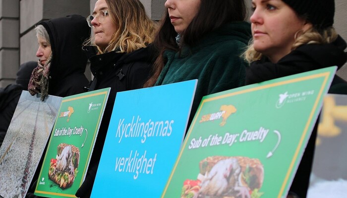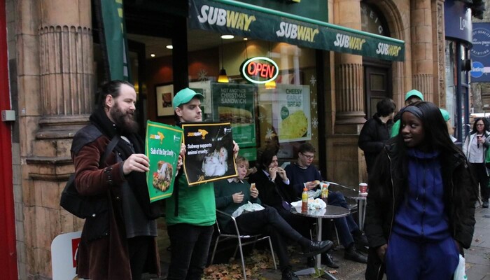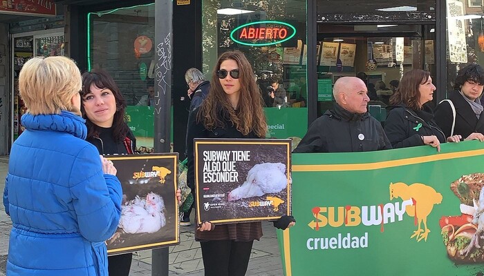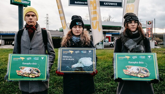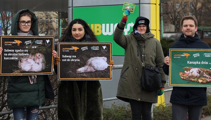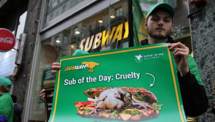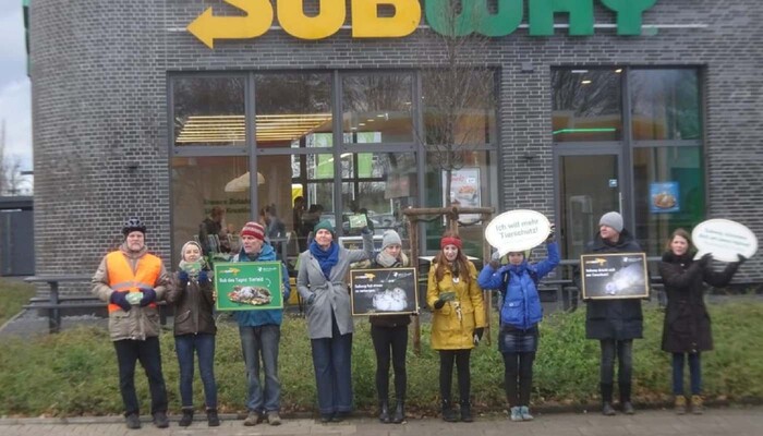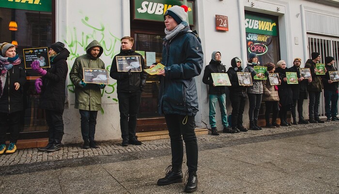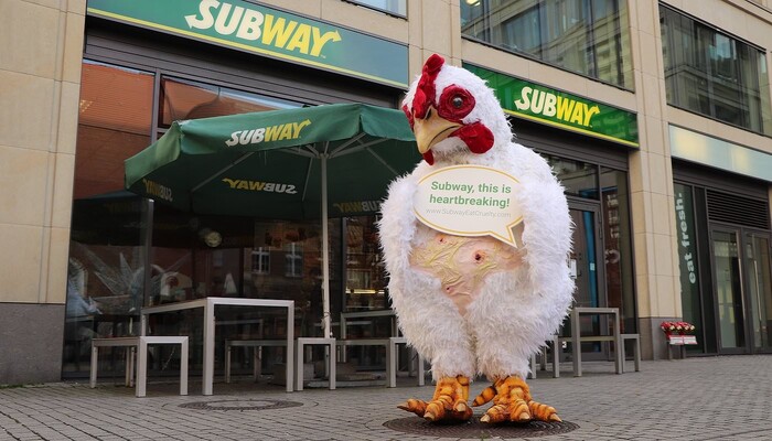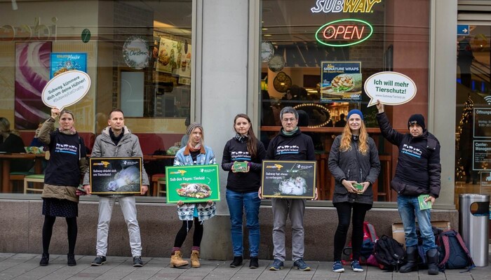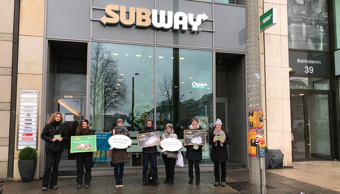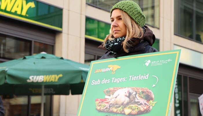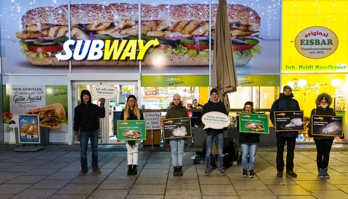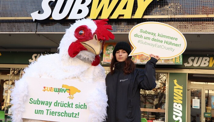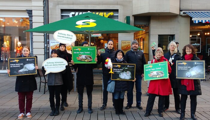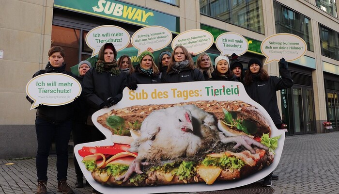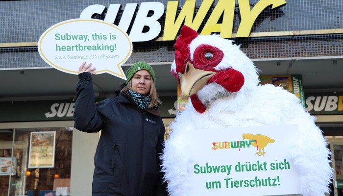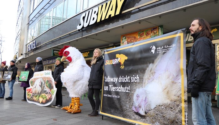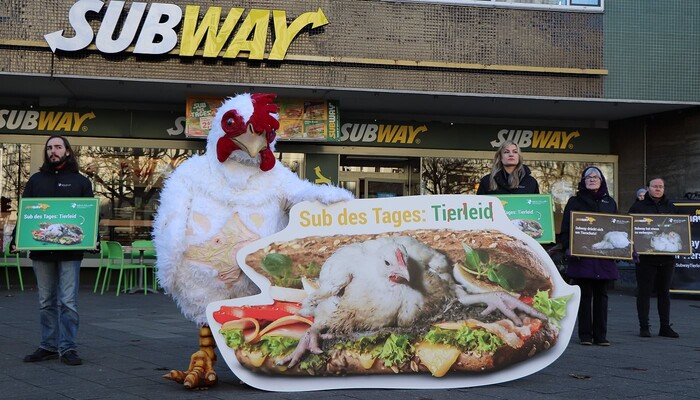 Mit einem riesigen »Sub des Grauens«, Protestschildern und unterstützt durch ein trauriges »Masthuhn« haben wir am 9. Dezember 2019 am Berliner Ku’damm vor der ältesten Subway-Filiale Deutschlands eine bundesweite Aktionswelle zu unserer aktuellen Kampagne gegen den Sandwich-Konzern eingeläutet. In Bielefeld, Bremen, Dresden, Erfurt, Hamburg, Wiesbaden und weiteren Orten in Berlin fanden in den darauffolgenden Tagen ähnliche Proteste vor Subway-Restaurants statt. Die Fast-Food-Kette ist mit mehr als 42.000 Filialen das größte Franchise-Unternehmen der Welt.