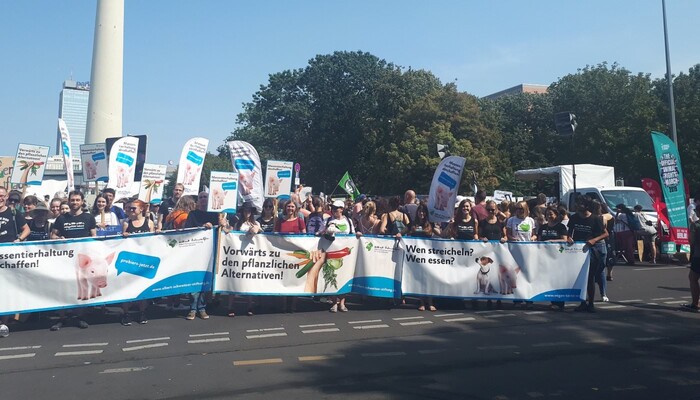 Auch der Animal Rights March am Sonntag ist mit rund 5.500 Teilnehmenden wieder gewachsen – auf beinahe doppelt so viele Demonstrierende wie im Vorjahr. Das Organisationsteam vom »Tierrechtsaktivistenbündnis«, das auch in der Hamburger AG der Albert Schweitzer Stiftung aktiv ist, möchte damit auf die Haltung und Ausbeutung fühlender Lebewesen sowie die damit verbundene Zerstörung des Planeten aufmerksam machen. In zahlreichen Städten auf der ganzen Welt gibt es inzwischen ähnliche Veranstaltungen. Ursprung der Bewegung war der Animal Rights March in London im Jahr 2016 mit circa 2.500 Menschen – 2018 waren es schon rund 28.000 Teilnehmende in 25 Städten, davon mehr als 3.000 in Berlin.