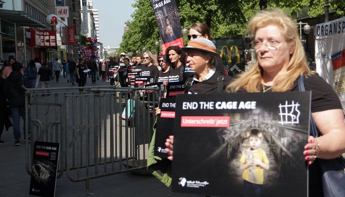 Seit dem 4. bis zum 18. Mai demonstrieren bundesweit zahlreiche Aktive der Albert Schweitzer Stiftung für unsere Mitwelt gegen Käfighaltung. Sie machen auf die in Europa immer noch verbreitete grausame Haltung von Sauen, Kälbern, Kaninchen und Vögeln in Käfigen aufmerksam. In insgesamt 14 Städten sammeln sie Unterschriften für die Europäische Bürgerinitiative »End the Cage Age«.