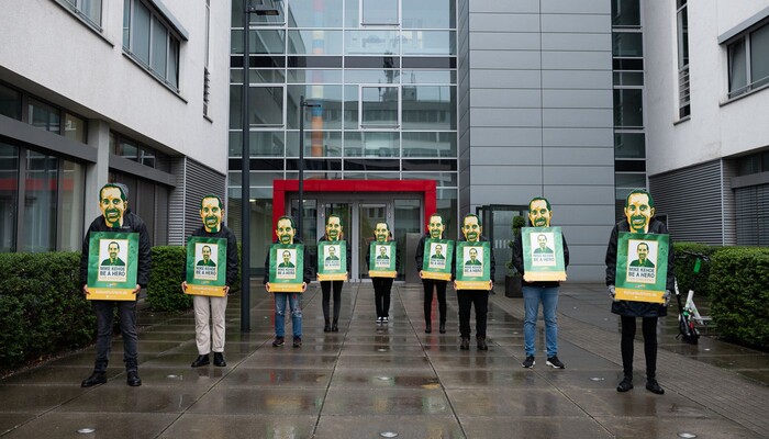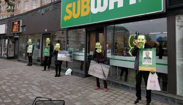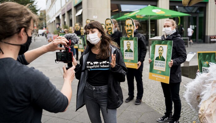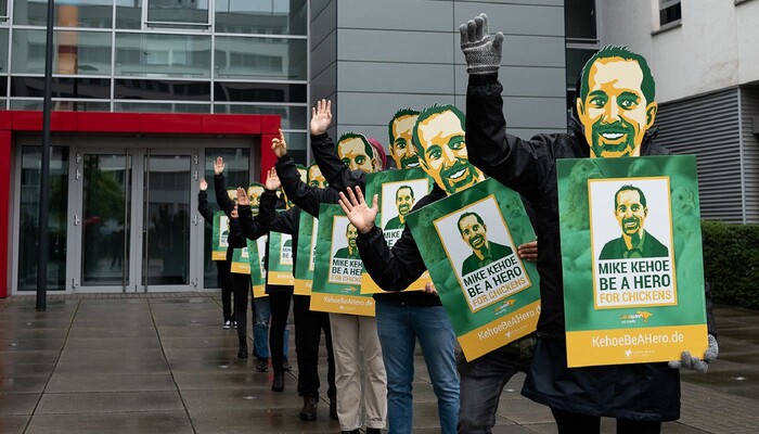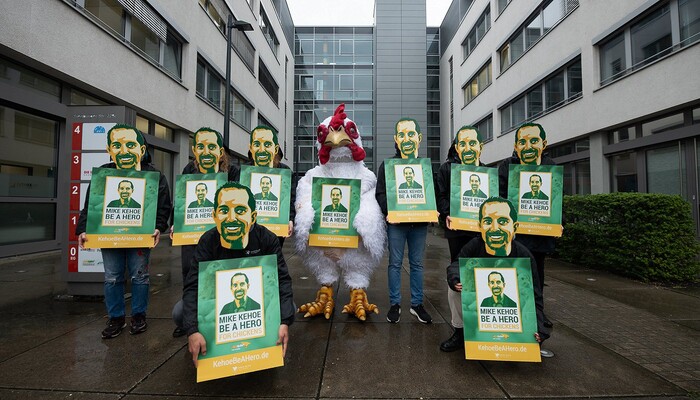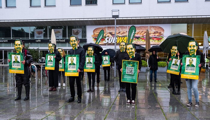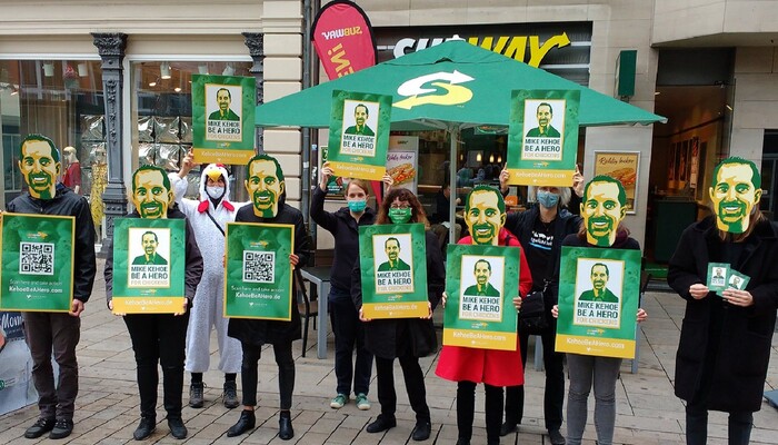 Rund 20 grün-gelbe Mike Kehoes standen am Donnerstag, den 24. September, vor der Subway-Filiale in der Spandauer Straße 3 unweit des Berliner Doms und appellierten an ihr »Original«, zum Helden für Hühner zu werden. Der »original« Mike Kehoe ist der neue Präsident für die Region Europa bei Subway. In seiner Hand liegt es, ob sich der Sandwich-Konzern der Europäischen Masthuhn-Initiative anschließt und damit Millionen Hühnern hilft. Bisher ignoriert das europäische Management die Forderung nach höheren Tierschutz-Standards. Daher lautet unser »Weckruf« an den neuen Subway-Chef: »Mike Kehoe be a Hero for Chickens!« (»Mike Kehoe, sei ein Held für die Hühner!«)