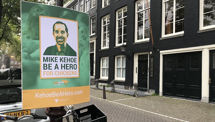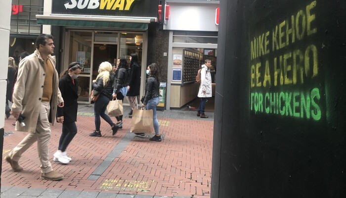 In den vergangenen Tagen haben unsere Aktiven und wir weitere Aktionen auf die Beine gestellt: In Bonn, Dresden, Wiesbaden und auch wieder in Köln, vor der Deutschland-Zentrale von Subway. 22 europäische Tierschutzorganisationen der Open Wing Alliance verbreiten die Botschaft in 16 weiteren europäischen Ländern. In der Amsterdamer Innenstadt, wo Subway seine Europa-Zentrale und Mike Kehoe sein Büro hat, tauchen Kehoes Konterfei und unser Appell zwei Wochen lang auf hunderten Plakaten, Graffitis und sogar einer mobilen LED-Wand auf.