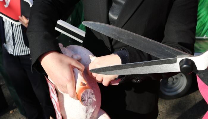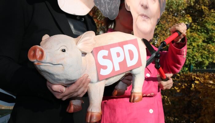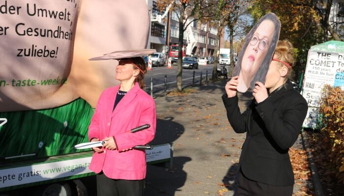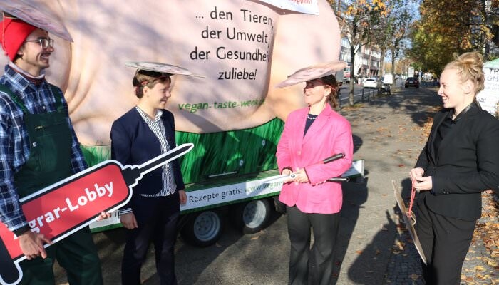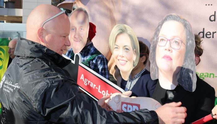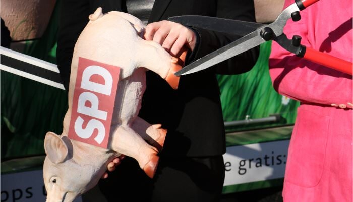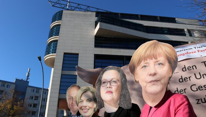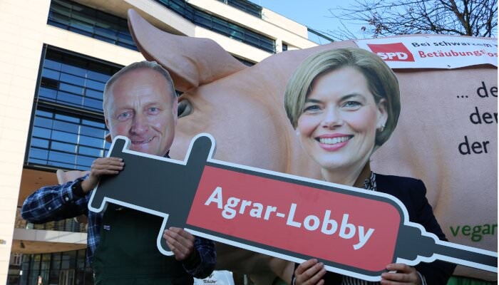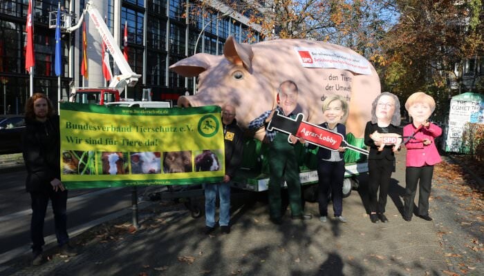 Mit den Konterfeis von Angela Merkel, Andrea Nahles, Julia Klöckner und Joachim Rukwied nahmen die Tierschützer vor dem Willy-Brandt-Haus die symbolische Kastration eines Ferkels vor, das für die Haltung der SPD beim Tierschutz steht. Wie auch andere Tierschutzorganisationen wirft die Albert Schweitzer Stiftung der SPD vor, sich vor den Karren von Agrar-Lobby und Koalitionspartnern spannen zu lassen.