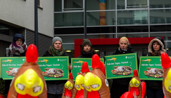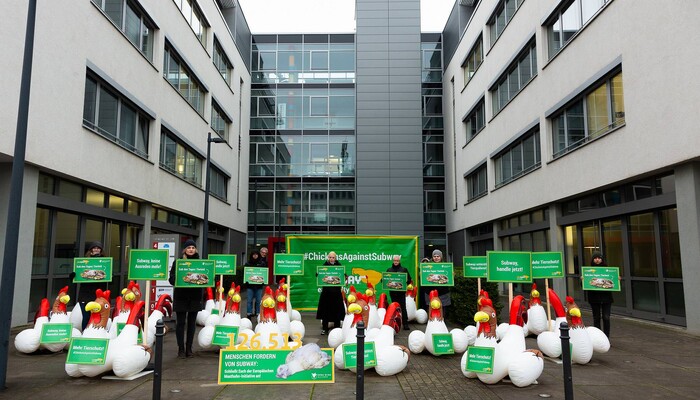 Mit gut 20 großen, aufblasbaren Hühnern demonstrierte die Albert Schweitzer Stiftung für unsere Mitwelt in Köln vor dem deutschen Firmensitz des Sandwich-Konzerns Subway. Die Tierschützer überreichten Unterschriften einer Petition gegen das Unternehmen, die mittlerweile fast 130.000 Mitzeichner hat. Sie wollen Subway dazu bewegen, seine Tierschutzstandards für sogenannte Masthühner zu erhöhen. Dazu soll die Fast-Food-Kette sich der Europäischen Masthuhn-Initiative anschließen. Subway sträubt sich seit Jahren, machbare Verbesserungen für die Tiere bei seinen Lieferanten durchzusetzen.