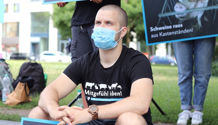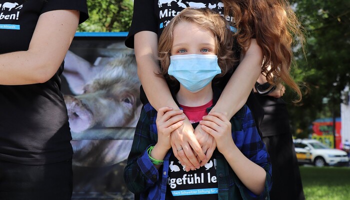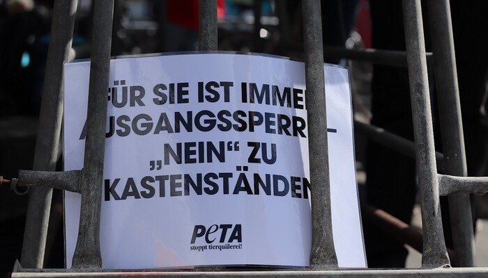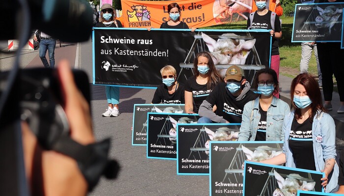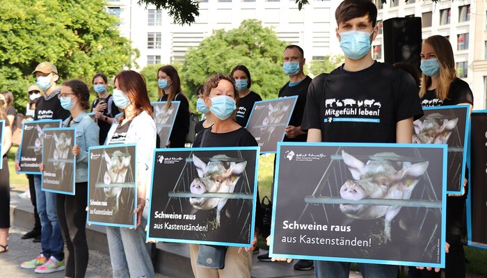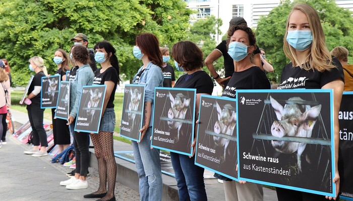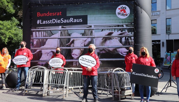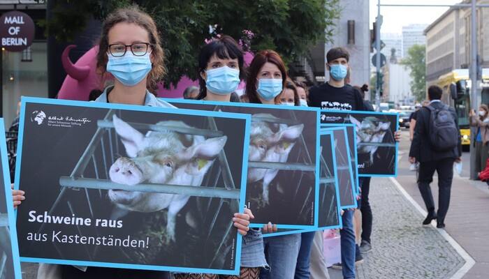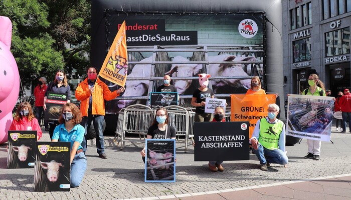 Zahlreiche Tierschutz-Aktivist:innen verschiedener Organisationen protestierten heute Morgen schräg gegenüber dem Bundesratsgebäude am Leipziger Platz. Allein von der Albert Schweitzer Stiftung für unsere Mitwelt waren rund 30 Aktive gekommen. Ihr Ziel: Das Ende der Kastenstand-Haltung von Sauen. Die Stimmung war gedrückt, denn trotz monatelangen Drucks auf Politiker:innen verschiedener Parteien zeichnete sich ab, dass die Länderkammer einem Kompromiss zustimmen würde, der die Sauen-Käfige noch lange erlaubt.
