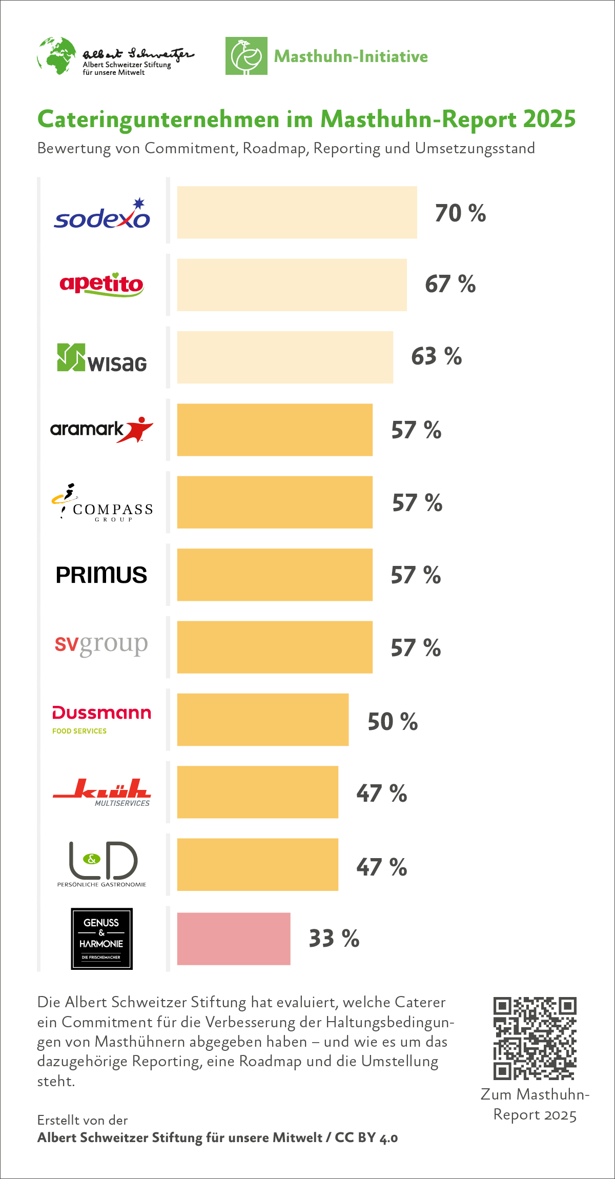 Erfreulicherweise haben sich die Top 10 der größten Catering-Unternehmen bereits zur MHI bekannt. Gleichzeitig sind unklare oder unvollständige Reporting-Standards aber besonders zu beobachten. Regulatorische Hürden werden von manchen Unternehmen als Ausrede genutzt, um Verbesserungen zu verzögern. Unternehmen kündigen zwar den ersten Einsatz von MHI-konformer Ware an, bleiben aber schmallippig, wenn konkrete Zahlen gefordert sind.