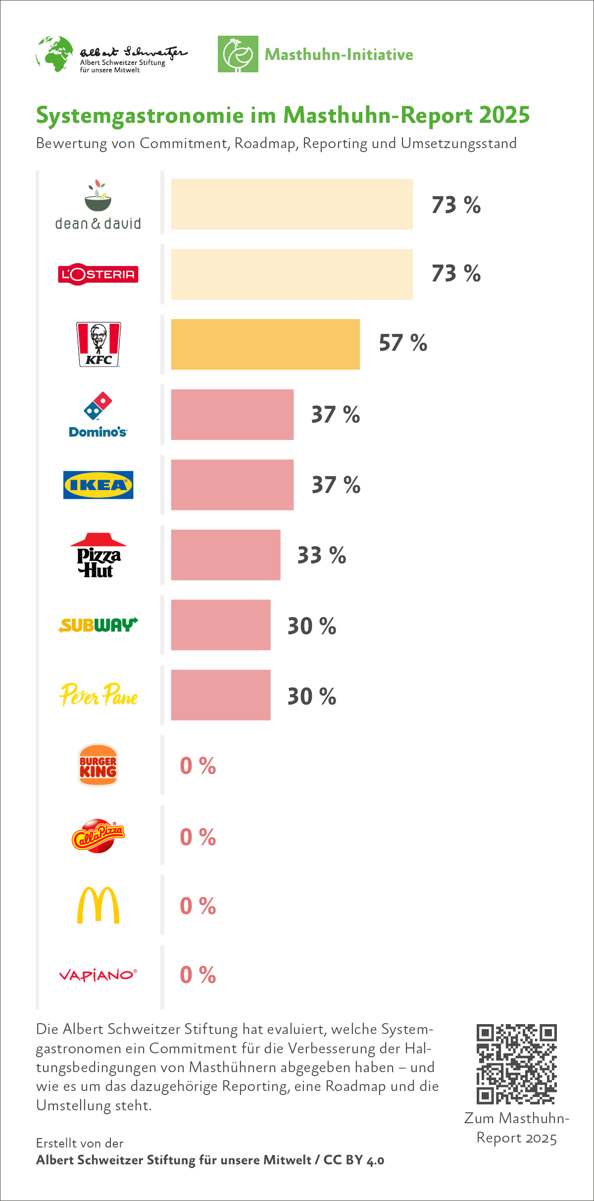 Hans im Glück beeindruckt: Das Burger-Restaurant hat bereits eine vollständige Umstellung auf MHI-konforme Produkte geschafft. L’Osteria zeigt, wie durch detailliertes Reporting und eine klare Roadmap Punkte gewonnen werden können. Das Unternehmen schneidet um rund 30 Prozentpunkte besser ab als im vergangenen Jahr. Dean & David ist ebenfalls zwei Stufen aufgestiegen.