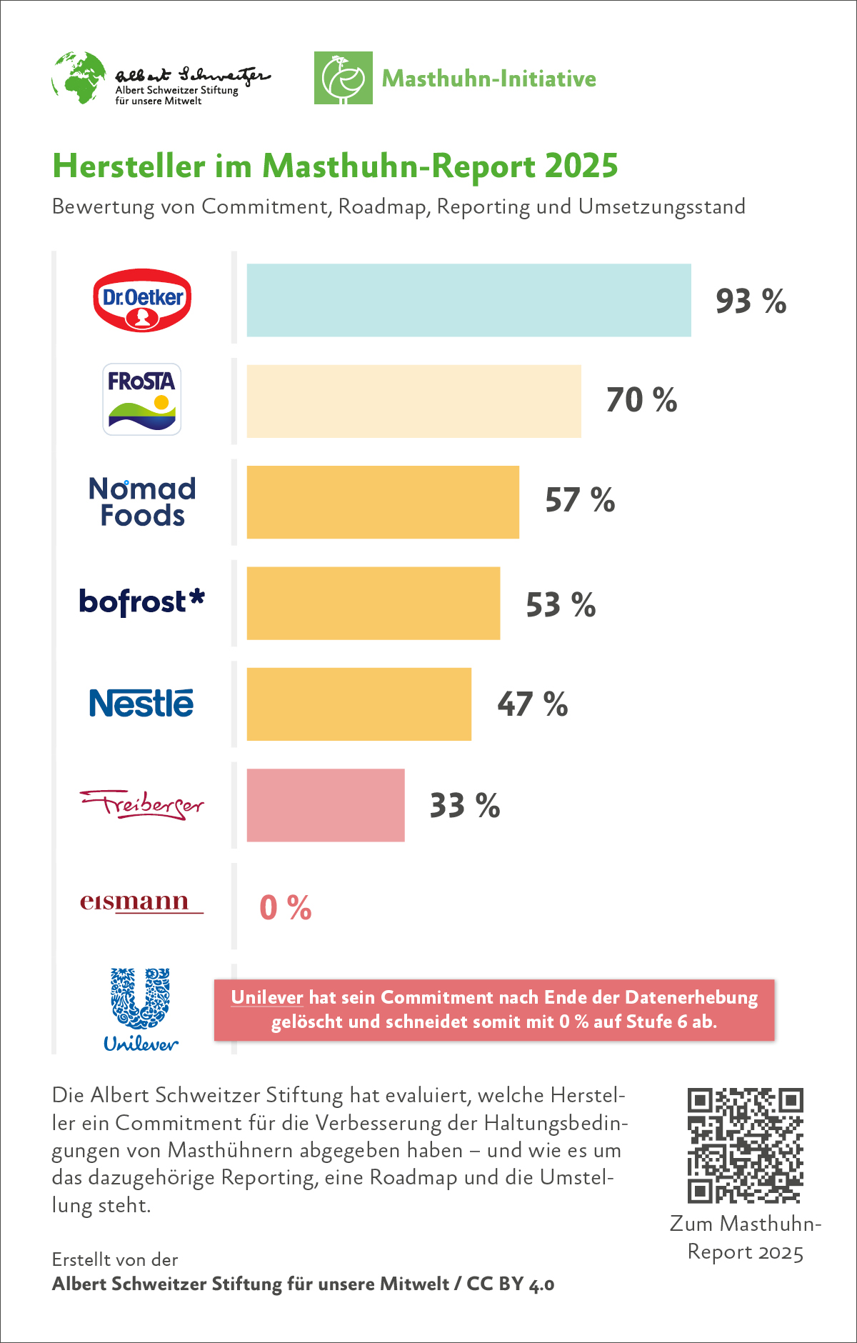 Millionen Masthühner leben in deutschen Ställen unter oft qualvollen Bedingungen. Doch nehmen Unternehmen ihre Versprechen ernst, dies zu ändern? Der aktuelle Masthuhn-Report 2025 der Albert Schweitzer Stiftung für unsere Mitwelt macht deutlich: Während mehr als 110 Unternehmen der Lebensmittelwirtschaft mittlerweile höhere Tierschutzstandards umsetzen, blockieren Branchengrößen weiterhin jede Verbesserung. Seit 2022 prüft die Albert Schweitzer Stiftung systematisch, ob Unternehmen der Lebensmittelbranche ihre Selbstverpflichtungen zur Masthuhn-Initiative (MHI) einhalten. Das Ergebnis: Es gibt Lichtblicke – aber auch hartnäckige Verweigerer, die den Fortschritt bremsen.