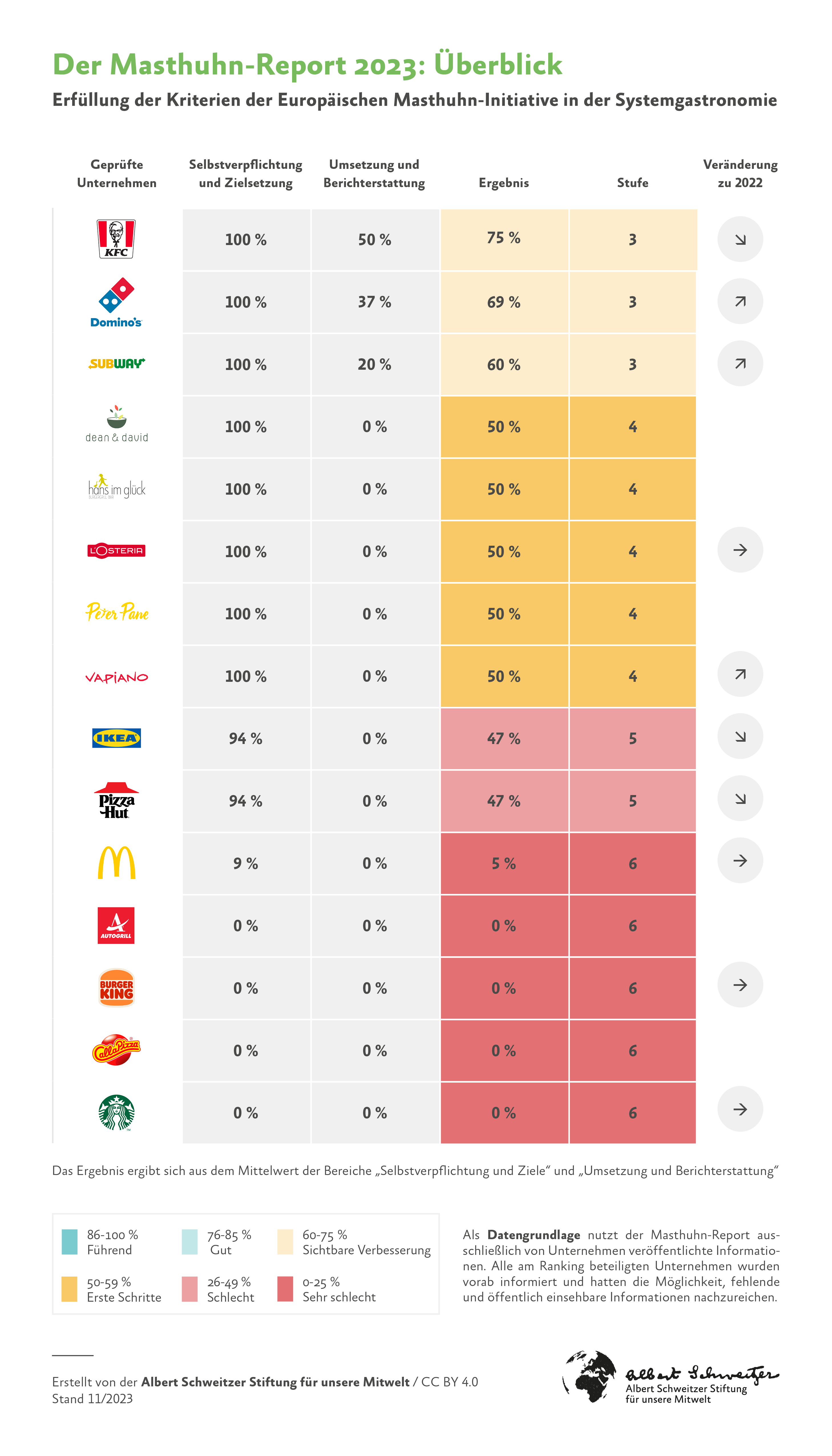 Besonders bedauerlich ist das Ergebnis von Starbucks mit 0 % auf Stufe 6. Das Unternehmen hat in Deutschland keine Verpflichtung zur Masthuhn-Initiative abgegeben und hinkt damit seinen Commitments in Großbritannien, den USA und Kanada hinterher.