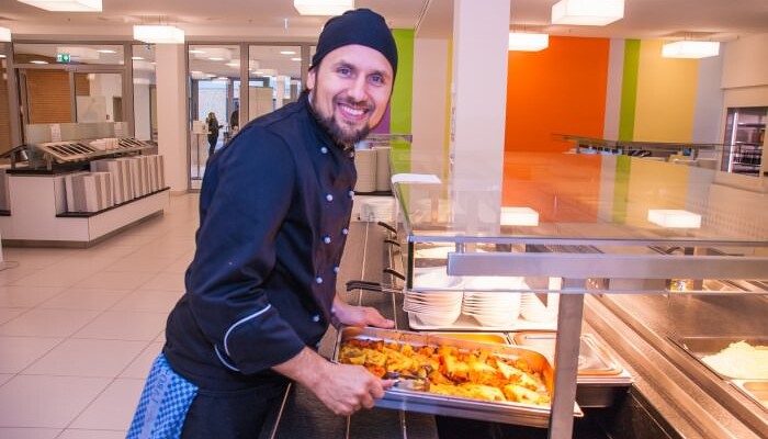 Ein besonderes Highlight war der Besuch des bekannten veganen Kochs Björn Moschinski in Heidelberg. Mit seinem Vortrag »Geiler Geschmack braucht kein Fleisch« zeigte er den Studierenden, dass eine rein pflanzliche Ernährung nicht nur gesund, sondern auch außerordentlich lecker sein kann. Das bewies Moschinski dann auch sofort: Er führte die Köche der Mensa Heilbronn-Sontheim im Rahmen einer Kochschulung in die Theorie und Praxis der veganen Küche ein und kochte anschließend live in der Mensa. »Ich freue mich sehr, dass wir mit Björn Moschinski einen der Stars der veganen Szene gewinnen konnten. Er hat das Mittagessen in unserer Mensa zu einem ganz besonderen Ereignis gemacht«, sagt Ulrike Leiblein, Geschäftsführerin des Studierendenwerks Heidelberg.