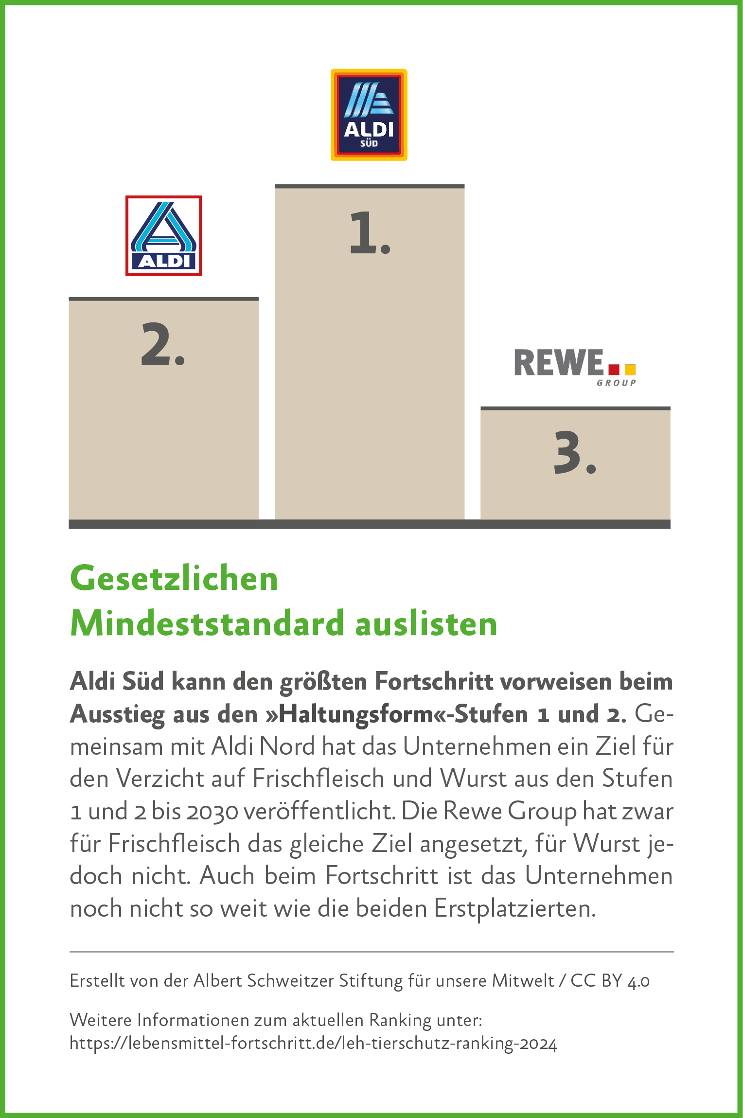 Aldi Süd und Aldi Nord erreichen jeweils 36 % der möglichen Punkte und übernehmen damit die Führung des Rankings. Punkten können die Discounter u. a. bei den Tierschutzrichtlinien für Legehennen, Küken und Junghennen: Aldi stellt seine Eigenmarkenprodukte auf Eier nach KAT-Standards um und berichtet transparent darüber.