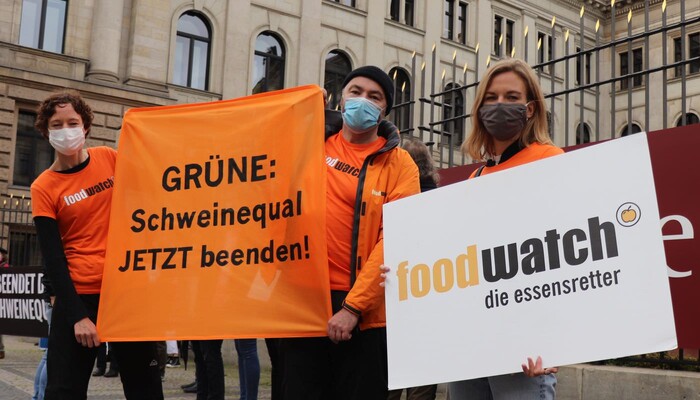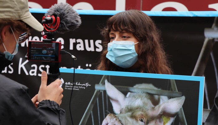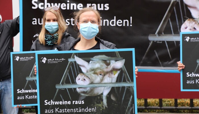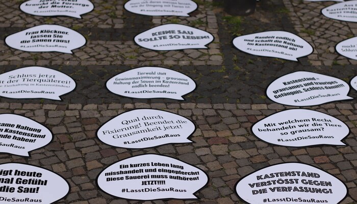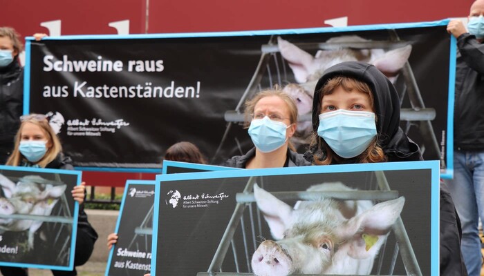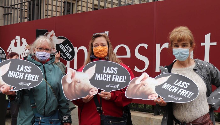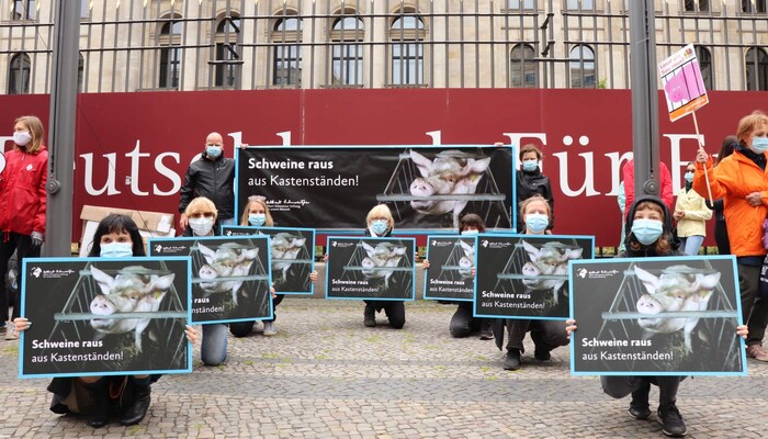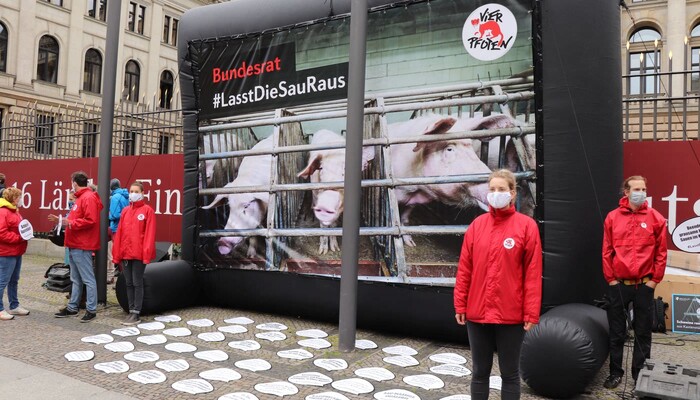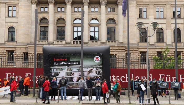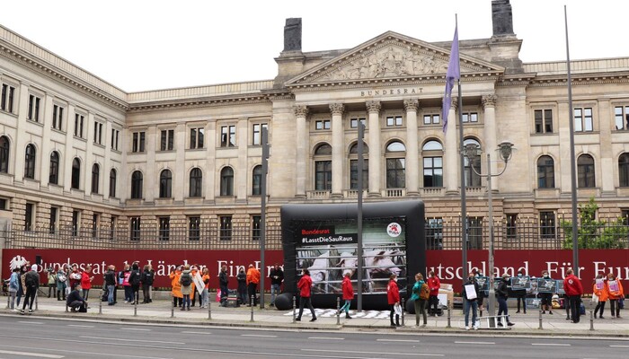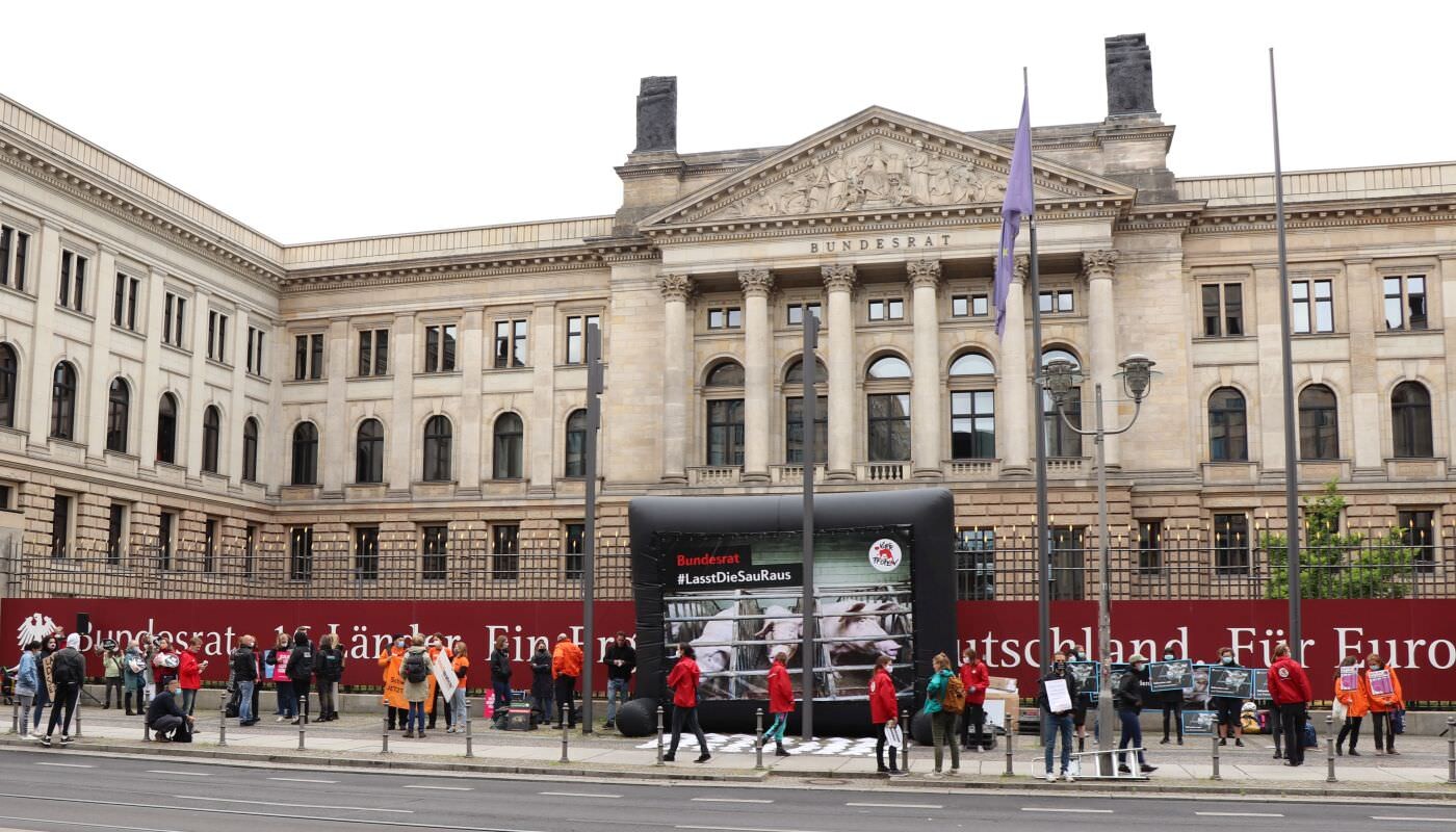 Heute haben wir und zahlreiche andere Organisationen unsere Kritik an diesem dreisten Verordnungsentwurf und der tierquälerischen Kastenstandhaltung nochmals lautstark deutlich gemacht. Mehr als 70 Aktivist:innen der Albert Schweitzer Stiftung, von Animal Equality, dem Bundesverband Tierschutz, Campact, Compassion in World Farming, Foodwatch, Peta, ProVieh und Vier Pfoten haben sich für eine Protestaktion vor dem Bundesratsgebäude in der Nähe des Potsdamer Platzes versammelt. Mit einem haushohen Aufsteller, zahlreichen Bannern und Protestschildern sowie Lautsprecherdurchsagen waren wir weder zu übersehen noch zu überhören.