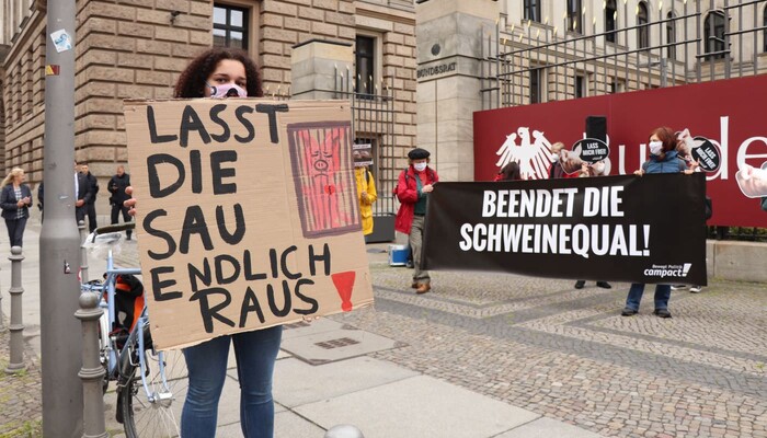 Seit Monaten protestieren wir mit zahlreichen anderen Organisationen gegen den Verordnungsentwurf der Bundesregierung, der illegale Kastenstände legalisieren soll. Nachdem der Entwurf von allen Seiten massiv kritisiert worden war, arbeiteten die Länder einen Änderungsvorschlag aus. Dieser sollte heute Morgen im Bundesrat zur Abstimmung stehen. Dazu kam es jedoch – zum Glück – nicht. Denn der Kompromiss wäre ein fauler zu Lasten der Sauen gewesen.