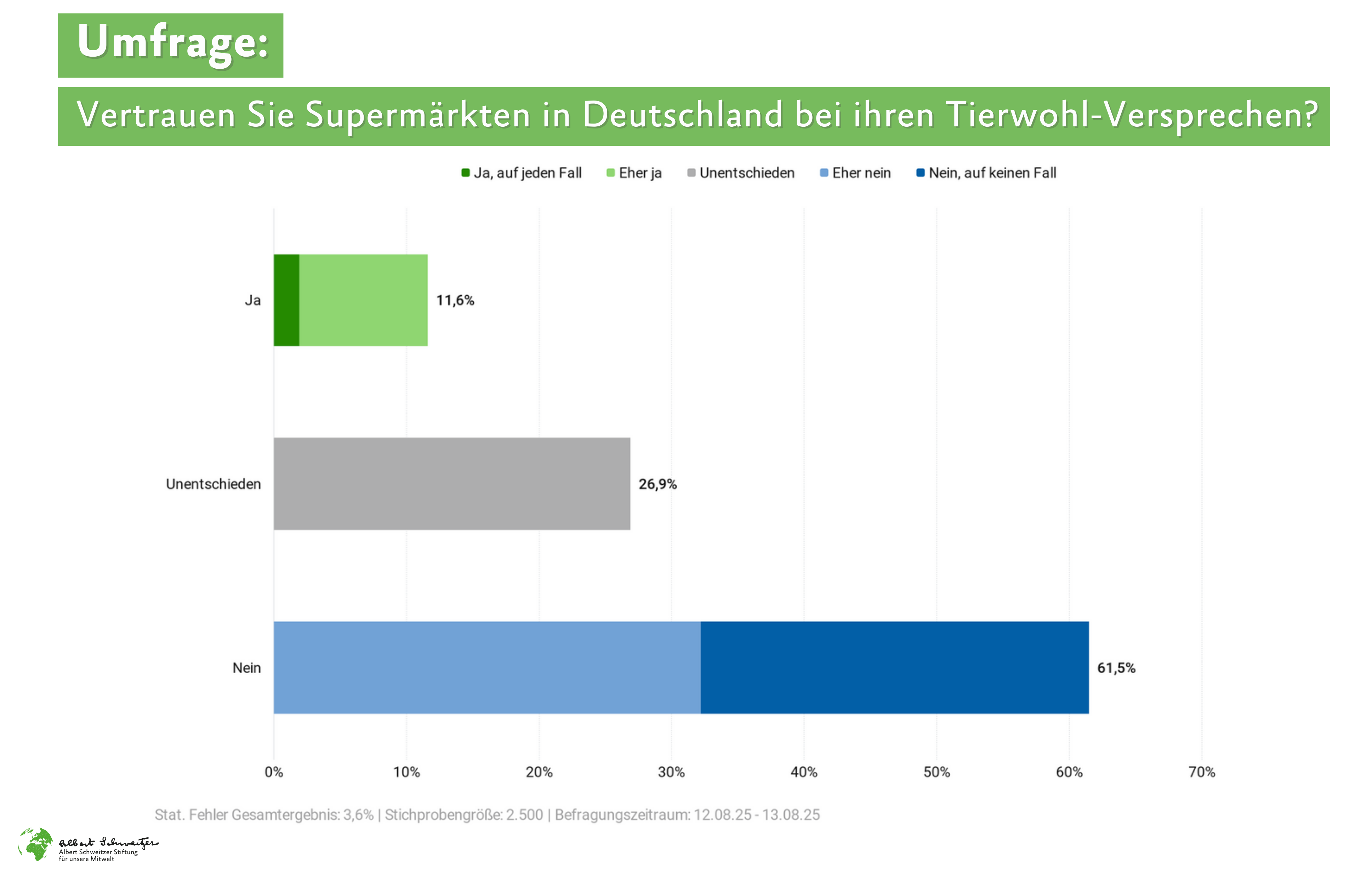 2.500 Verbraucherinnen und Verbraucher wurden von Civey im Auftrag der Albert Schweitzer Stiftung für unsere Mitwelt zu ihrem Vertrauen in den Lebensmitteleinzelhandel befragt.
