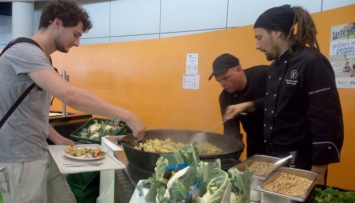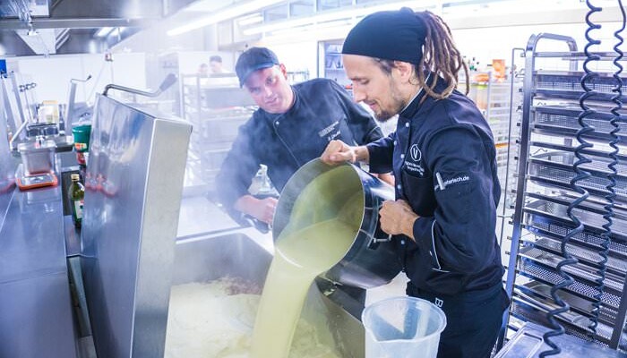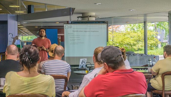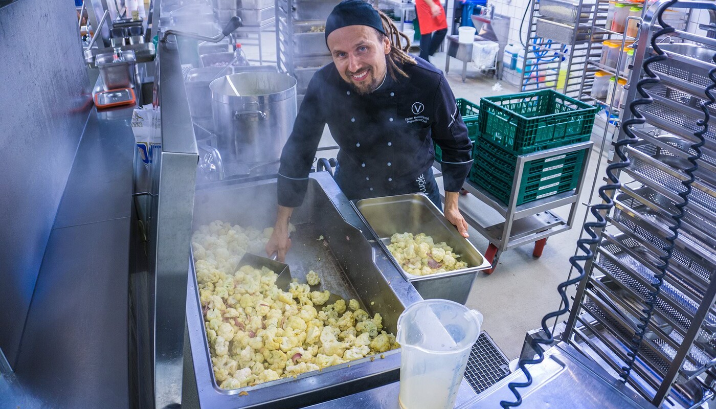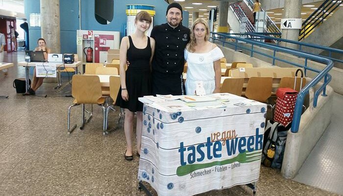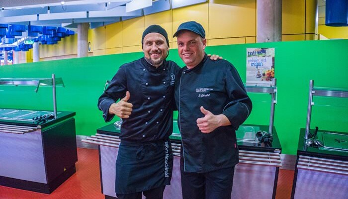 Als besonderes Highlight der Vegan Taste Week war der prominente vegane Koch Björn Moschinski an zwei Tagen vor Ort. In seiner Schulung für die Mensaköche gab er Tipps aus seinem Praxiswissen weiter. Zudem informierte er mit seinem Vortrag »Geiler Geschmack braucht kein Fleisch« über die pflanzliche Küche. Am Folgetag konnten sich die Studierenden dann beim Live Cooking selbst von seinen Kochkünsten überzeugen. Während der gesamten Woche war darüber hinaus unsere Heidelberger Aktionsgruppe mit einem Infostand dort, um den Studierenden Fragen rund ums Thema »Vegan« zu beantworten. »Die Vegan Taste Week steht beim Studierendenwerk Heidelberg nicht etwa für Verzicht, sondern für Genuss und die Freude an neuen kulinarischen und gedanklichen Erfahrungen«, sagt Ulrike Leiblein. »In der Schulung unseres Mensa-Teams und dem Vortrag von Björn Moschinski finden wir die Inspiration und Kreativität, die wir unseren Gästen tagtäglich weitergeben möchten.«