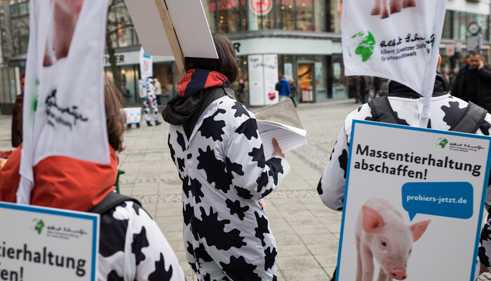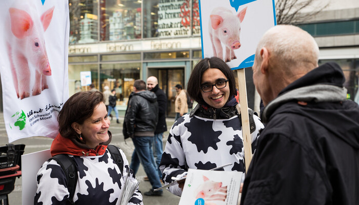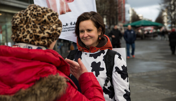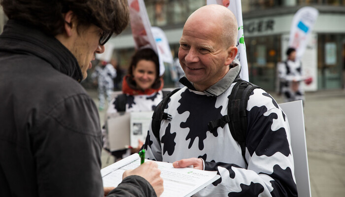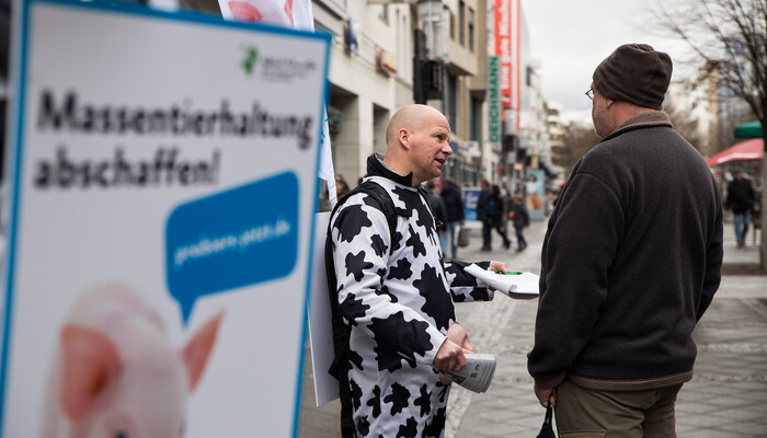 In den letzten Monaten haben wir ein neues Aktionskonzept mit sogenannten Moving Boards ausprobiert. Dabei handelt es sich um Rucksäcke mit Rückenschildern und aufmontierten Flaggen (»Beachflags«). Mit dieser Ausstattung und unseren einheitlichen Kuhkostümen sind wir schon aus weiter Entfernung zu erkennen. Ein Vorteil ist außerdem, dass wir mit den Moving Boards (die wir auch gern »Muuuhving Boards« nennen) offensiv, flexibel und dynamisch in den Fußgängerzonen unterwegs sind. Wir müssen nicht wie am Infostand auf Menschen warten, sondern können uns aktiv auf die Menschen zubewegen und sie ansprechen.