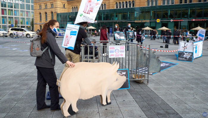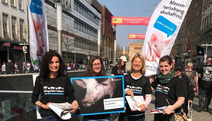 Um das Tierleid in der Massentierhaltung permanent im Blick zu halten und über die Tierhaltungsbedingungen zu informieren, führen wir regelmäßig eine Mahnwache, eine sogenannte Silent Line, durch. Mit dem Angebot der "Woche gegen Massentierhaltung" bieten wir dabei an unserem Stand Passant:innen, die sich mit uns aktiv für ein Ende der Massentierhaltung einsetzen wollen, Unterstützung beim Wechsel in eine rein pflanzenbasierte Ernährung an.