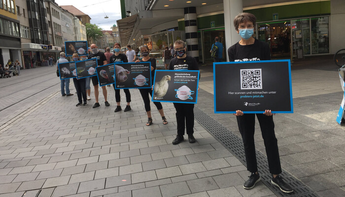 Unsere Einsätze finden etwa einmal im Monat in Form von Versammlungen oder Infoständen statt. Mit Moving Boards, Selbst-Wenn- Broschüren, Klemmbrettern zum Sammeln von Einträgen für die Vegan Taste Week und einem gewinnenden Auftritt erläutern wir die Vorzüge einer pflanzlichen Ernährung und rufen die Verbraucher:innen zum Protest auf dem eigenen Teller auf. In einer gut eingespielten Gruppe ist das ein tolles Team-Erlebnis, das viel Spaß bringen kann und zugleich sehr effektiv ist. Immer wieder probieren wir daneben auch neue Aktionsformen aus und nehmen Anregungen gerne auf.