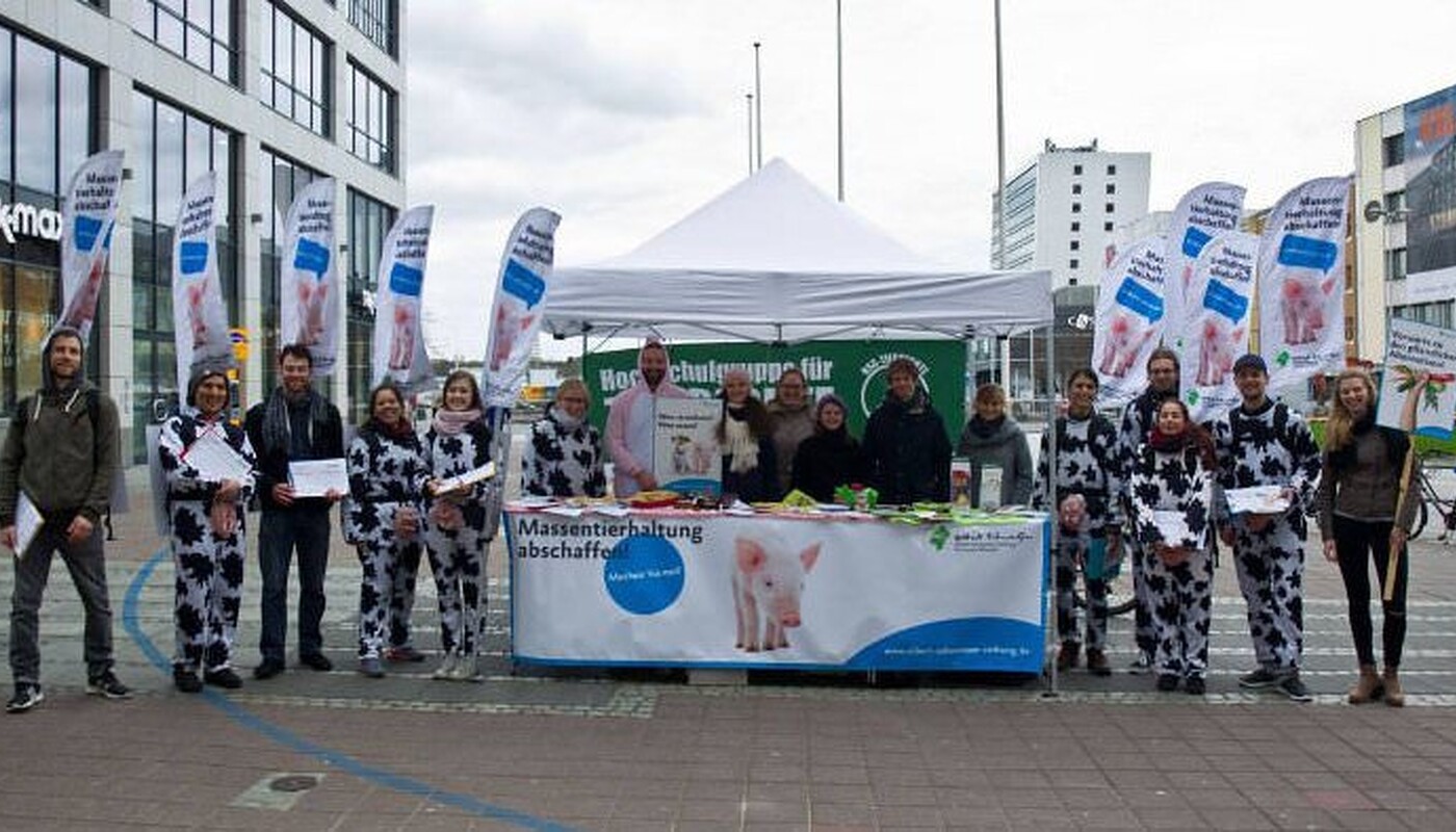 Bei unserem Einsatz für die Tiere pflegen wir einen kollegialen Austausch mit der Hochschulgruppe für Tierrechte an der Uni Kiel. Diese Gruppe deckt noch weitere Themenbereiche außerhalb des Tätigkeitsfelds der Albert Schweitzer Stiftung ab (Pelz, Tierversuche, Jagd, Zirkusse usw.). Außerdem sind wir mit den Aktionsgruppen der Albert Schweitzer Stiftung aus unseren Nachbarstädten Hamburg und Lübeck vernetzt.