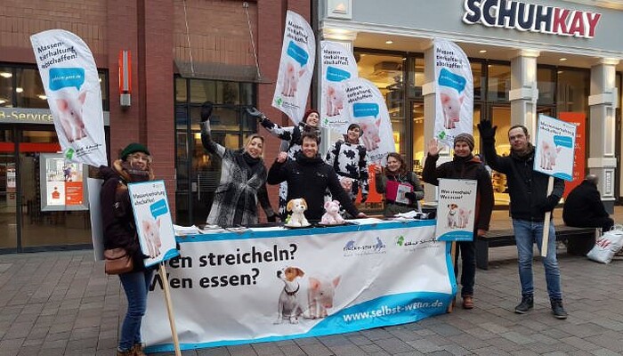 Im persönlichen Gespräch mit den Menschen vor Ort informieren wir über die verheerenden Bedingungen in der Massentierhaltung und deren Auswirkungen auf Tier, Mensch und Umwelt. Mit der Vegan Taste Week und der Selbst-Wenn-Broschüre zeigen wir gesunde und schmackhafte pflanzliche Alternativen zum Konsum von Tieren auf.