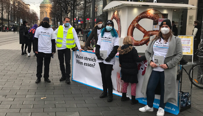 Wir sind eine ganz frische AG im Aufbau und jede Verstärkung ist herzlich willkommen. Zu den brennenden Themen Tierschutz, Klima und Umwelt wollen wir die Öffentlichkeit weiter sensibilisieren und die kleinen Schritte aufzeigen, die bereits jede:r einzelne heute gehen kann (z. B. Ernährung). Ein Aushängeschild sind die Aktionspodeste, die es kreativ zu gestalten gilt: auffällig, künstlerisch und auch mal provokant. Wir möchten die Stiftung regelmäßig in Heidelberg und Mannheim repräsentieren, aber auch in Weinheim und anderen Gemeinden der Region für unsere Ideale einstehen. Dazu gehören auch Infostände bei größeren Veranstaltungen wie beispielsweise »Eine Welt Tage« in Heidelberg oder »Vegan im Quadrat« in Mannheim.