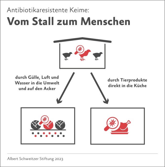 In einer deutschen Studie aus dem Jahr 2012 wurden in 85 % der Schweinemastanlagen und in 79 % der Vogelmastbetriebe resistente Keime in der Stallluft nachgewiesen. Außerhalb des Stalls waren die Keime noch in bis zu 300 Meter Entfernung nachweisbar.22